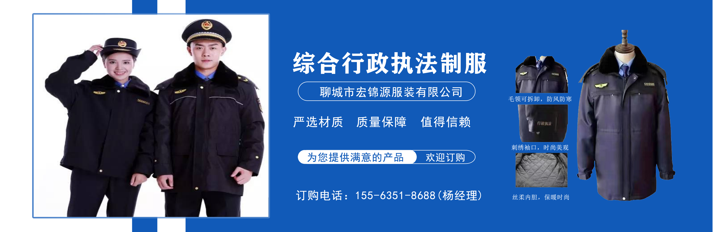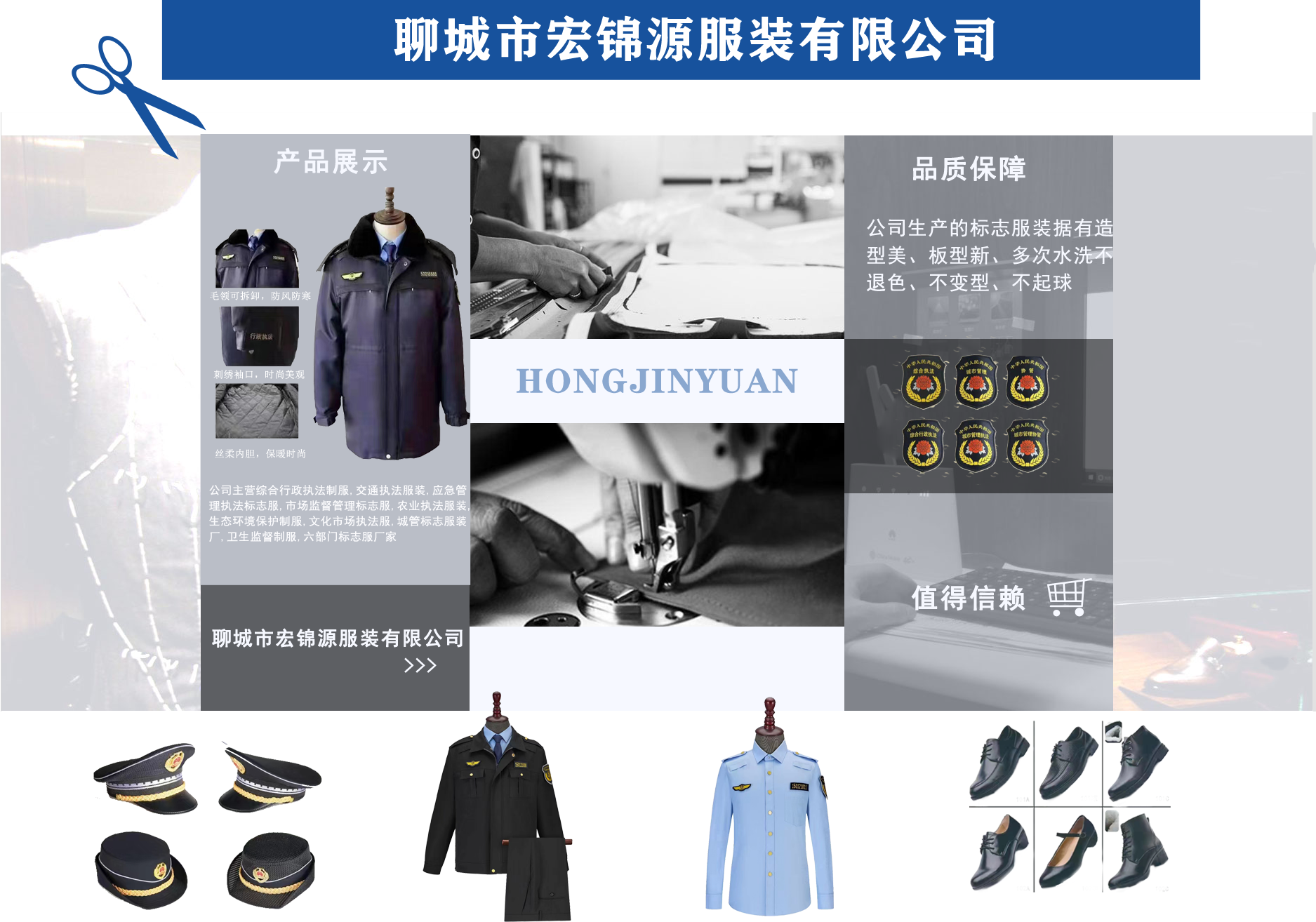 聊城市宏錦源服裝有限公司位于江北水城—山東聊城,地理位置優(yōu)越,交通便利。公司主營綜合行政執(zhí)法制服,交通執(zhí)法服裝,應急管理執(zhí)法標志服,市場監(jiān)督管理標志服,農業(yè)執(zhí)法服裝,生態(tài)環(huán)境保護制服,文化市場執(zhí)法服,城管標志服裝廠,衛(wèi)生監(jiān)督制服,六部門標志服廠家等,值得信賴! 公司生產的標志服裝據(jù)有造型美、板型新、多次水洗不退色、不變型、不起泡。 “認真辦事,踏實做人”是宏錦源的企業(yè)精神,我們的宗旨是:“用服務與真誠來換取你的信任與支持,互惠互利,共創(chuàng)雙贏!”我公司愿與國內外各界同仁志士竭誠合作,共創(chuàng)未來企業(yè)目標:在已選定的服飾領域中,成為行業(yè)的卓越者。 經(jīng)營理念:追求產品卓越,為用戶提供完美、高效的服務。...